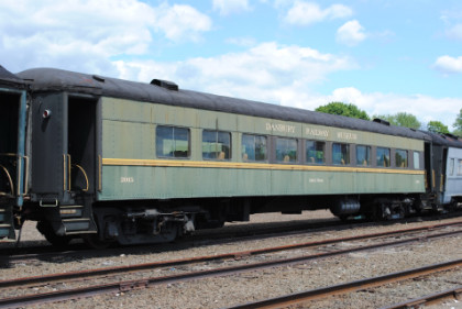 Danbury Railway Museum coach 2015 "John E. Flower", ex. Housatonic 2015, exx. Connecticut Department of Transportation 2015, exxx. South East Pennsylvania Transportation Authority 2015, exxxx. Reading Company 2015 (09-1949 Conversion to Class PBu Reclining Chair Car With Smoking Lounge), nee Reading Company 1355 built by Harlan and Hollingsowrth in 1922. It was donated by Connecticut Department of Transportation and arrived in 1995.