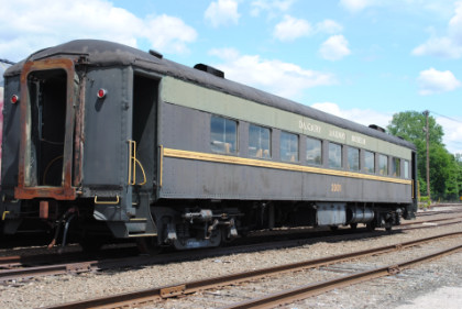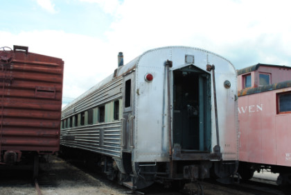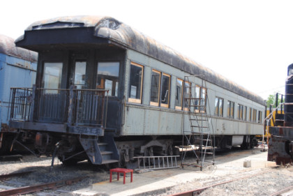 In 1932, half of the clerestory vents were enclosed and converted to ducting for air conditioning. The car remained in service on the Century until 1938, when the train service was updated with streamlined equipment. In June 1938. the car's open platform was converted to a closed vestibule and it was renamed "Connecticut"; it was then used in mid-train service on the Boston & Albany Railroad's New England States. It is at this time we believe the end wall of the former observation platform was moved, shortening the original platform by three feet. In 1947, the car was sold to the New York Central Railroad when Pullman divested itself of its operating division. It remained in service until 1956, after which it was stored by Pullman for a year before being sold to Crown Metal Products of Wyano, Pennsylvania, and was used as an office. It was subsequently sold to a private owner who reopened the observation end of the car before moving it to Essex. It was then moved to our museum before being donated.