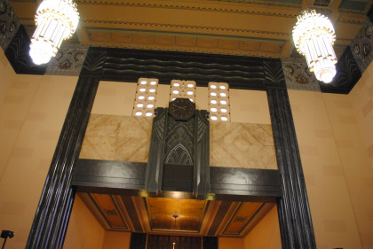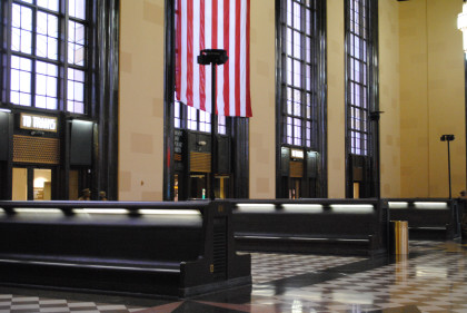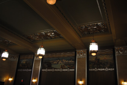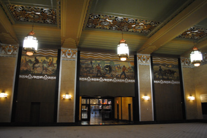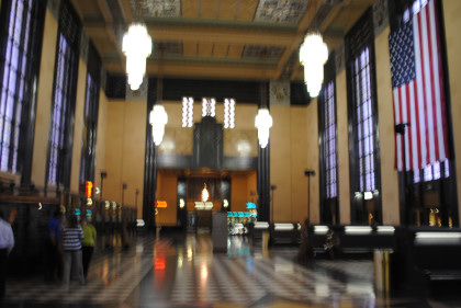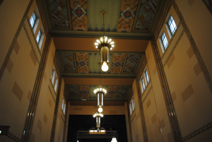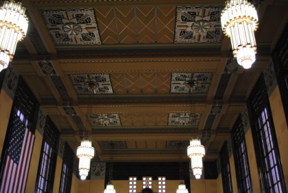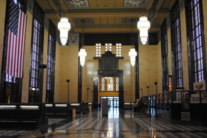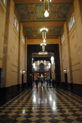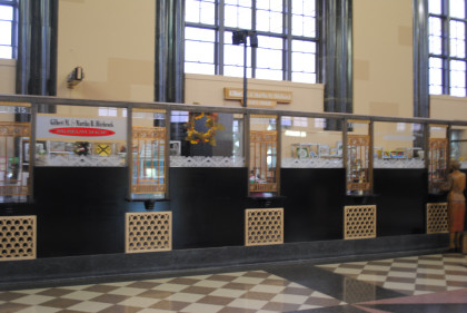 After twenty months and $3.5 million, the 124,000 square-foot building was complete. The station opened to great fanfare on January 15, 1931 and quickly became one of the busiest stations in the nation. At its peak, 64 passenger trains and some 10,000 passengers utilized the facility every day. The focal point is the Main Waiting Room, currently the Suzanne and Walter Scott Great Hall. Measuring 160 feet by 72 feet, it is spanned by a 60 foot high ceiling. The Hall features a ceiling of sculptured plaster, with painted gold and silver leaf trim, ten cathedral-like plate glass windows, a patterned terrazzo floor, columnettes of blue Belgian marble, and a wainscoting of black Belgian marble. Six immense chandeliers, 13 feet tall, five feet in diameter, and suspended 20 feet from the ceiling, light the Great Hall.