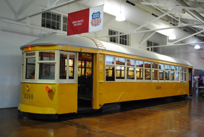Omaha and Council Bluffs Street Railway streetcar 1014 built by the railway in 1917 and operated until 1955. It then moved to the Twin Brooks Bible Camp from 1955 to 1982 and was acquired by the Durham Museum that year.