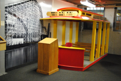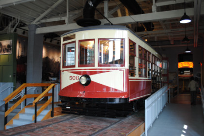 Our TourReading Transit & Light streetcar Birney safety car 506 built by Osgood-Bradley in 1920, ex. Buckingham Valley Trolley Association 506 1985 to 1999, nee Reading Transit & Light 506 1920 to 1947. It is on display as cutaway "Trolleys Exposed" exhibit.