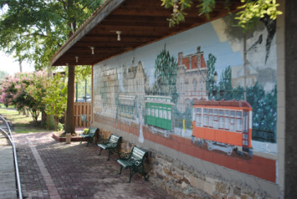 There is a very nice trolley mural on the wall which local artist John Bell, Jr. designed in 1990, and directed a team of his art students in painting it. The mural depicts the 50-year heyday of street railway transportation in Fort Smith, beginning with the mule-drawn streetcars of 1883, on the far left. The second car shown is an open car, in which the motorman stood outside. After that came the semi-convertible trolley and, on the far right, the Birney "safety car," which was used until Fort Smith Light & Traction Co. closed in 1933. Four historical buildings are shown in the background, including Fort Smith's W.H.H. Clayton house and the Fort Smith Art Center.