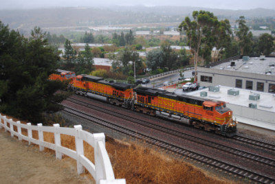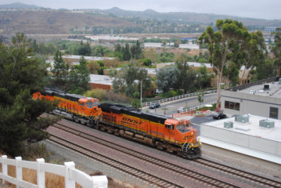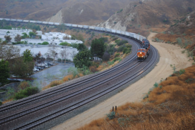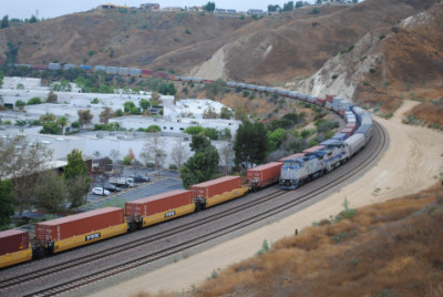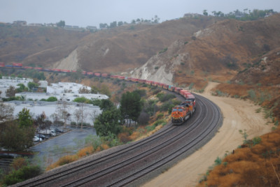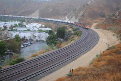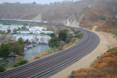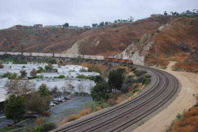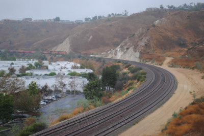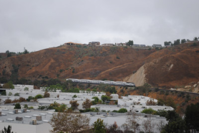 The Kelso Flyer was a chartered Amtrak train that ran from Los Angeles to Barstow, California on Saturday October 16, 2010, then onto Kelso before returning to Los Angeles the next day. I decided not to ride but to chase it, so I awoke to a wet morning on October 16 and after doing my morning duties, drove out to Weir Canyon Road off California Highway 91, then took that across the Santa Ana River and turned right onto La Palma Avenue. I then turned left on Via Loma De Yorba West and went under the tracks to Copper Canyon Road before turning around and parked on Via Loma then walked up the horse trail to my vantage point.