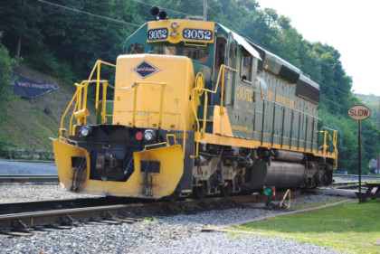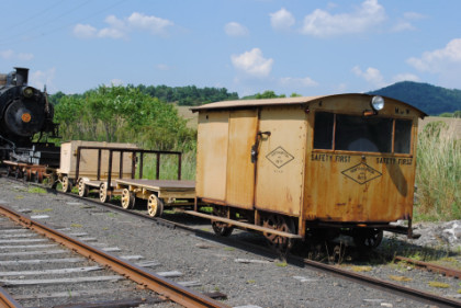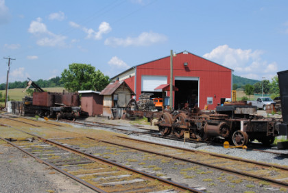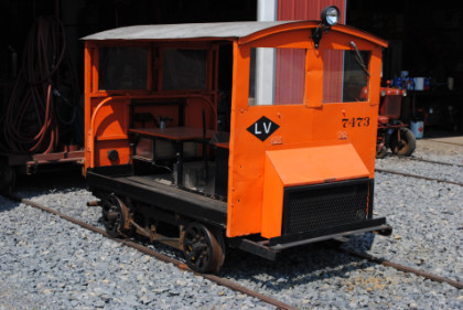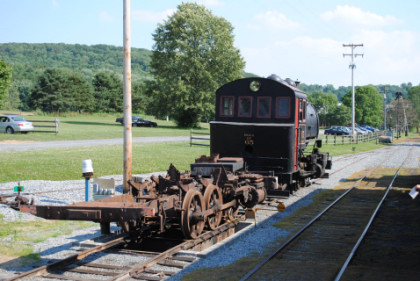 Wanamaker, Kempton and Southern 65 ton centre-cab switcher 734 nee US Metals and Refining Division of American Metals 4 built by General Electric in 1956. It was acquired from the Railway Restoration Project 113 in Minersville, Pennsylvania after it had been donated to them and in turn, was traded to the WK&S for Central of New Jersey business car 98. Before coming to the WK&S, 734 was stored at Koppers Corporation in Muncy and had been used to switch cars hauling scrap ties.