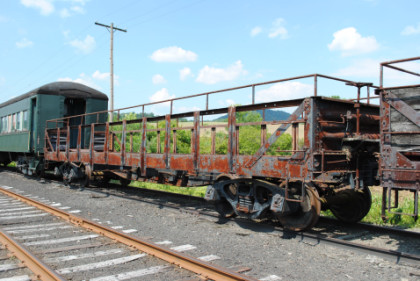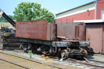 Lehigh & New England flat car 719 rebuilt from a box car around 1932 or 1933 and used in wreck service as a tie car or a boom car. The box car from which 719 was rebuilt was likely built sometime from 1908 to 1913 during a period that the LNE purchased 1,100 new box cars. It has a steel frame and a wood deck. The WK&S mechanically restored the car in preparation for a special LNE freight train that was conducted at the WK&S in 2000. Since then, all of the decking and paint has been replaced as well. This car is used to shuttle material and equipment around the yard. It is also used on for occasional Photo Freight Special train.