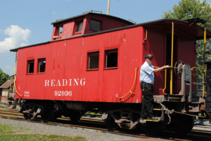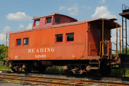 .Reading caboose 92830 built by the railroad in 1936. The trucks have Central of New Jersey markings because they were built from a combination of new and used parts, some of which came from the CNJ. It was retired around 1969 and Reading conductor Forrest Trittenbach, who worked the Perkiomen Branch, arranged for it to be donated for display at a park in Emmaus. Unfortunately the caboose became a hangout for delinquents and proved to be a liability. The caboose was next acquired by Railways to Yesterday, but there was no room for it at Orbisonia. So it was moved and stored by McHugh Brothers Heavy Hauling of Penndel, Pennsylvania. Railways to Yesterday never utilized the caboose and in April 1986, it was again moved from Penndel to Kempton.
