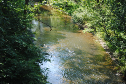 The two bridges here are known as "The Bridges". The longer southern span crosses the creek and also divides the railroad between Lehigh County to the north and Berks County to the south. The shorter northern span crosses an old mill race and farmer's road. But both the race and road are long abandoned. The fill between the two bridges was added just before the two existing concrete spans were constructed around 1918. Before that, the whole distance was spanned by a combination of wood trestles and a covered bridge. The current concrete bridges are typical of what would have been found up and down the Schuylkill & Lehigh line in the twentieth century.