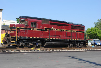 New Hope & Ivyland Railroad GP30 2198, ex. Penn Central 2198, nee Pennsylvania Railroad 2250 built by Electro-Motive Division in 1963. It was assigned to power some of the longest, heaviest and fastest freight trains that the railroad operated and could be seen traversing the mainline between New York, Philadelphia and Chicago, passing through a varied landscape which included the famous Horseshoe Curve. As delivered, 2250 wore a simplified dark "Brunswick Green" paint scheme with the railroad's familiar red and white Keystone logo applied to the sides and nose of the unit.