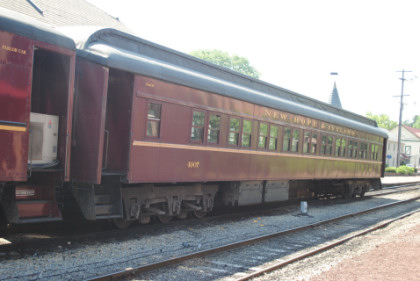 New Hope & Ivyland Railroad coach 4907, ex. Black River and Western 4097, ex. Canadian National 4097, exx. Canadian National 5242, nee Canadian Northern colonist sleeper 2877 built by Canadian Car and Foundry in 1919. It is the only passenger car currently in service on the railroad with a double-deck clerestory-style roof. As built, it was as a colonist sleeper car to convey persons arriving from other nations between eastern Canadian seaports and the largely unsettled western regions of the country. This ultimately led to the establishment of many towns and settlements still in existence in the modern era.