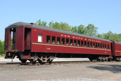 New Hope & Ivyland Railroad coach 1127, ex. Valley Forge Scenic Railroad 1776, nee Reading 1127 built by Bethlehem Steel Corporation's Harlan & Hollingsworth Division in 1924. It features a rounded "Turtleback" style roof instead of the older clerestory style. In addition, the interior walls originally came without decorative mahogany woodwork, with the New Hope and Ivyland shop later adding some to match the older fleet.