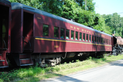 New Hope & Ivyland Railroad coach 1220, ex. Valley Forge Scenic Railroad 1775 "Pickering Valley", nee Reading 1220 built by Bethlehem Steel Corporation's Harlan & Hollingsworth Division in 1924. It features a rounded "Turtleback" style roof instead of the older clerestory style. In addition, the interior walls originally came without decorative mahogany woodwork, with the New Hope and Ivyland shop later adding some to match the older fleet.