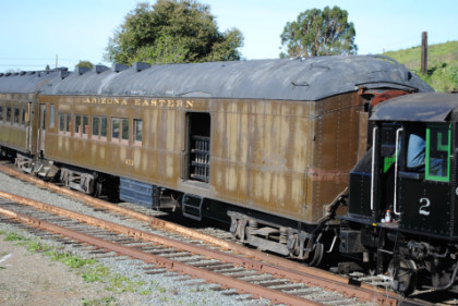 Arizona Eastern combine 453 built by Pullman in 1916 which became Southern Pacific 3176 after Arizona Eastern was absorbed by them on December 31, 1924. In 1946, the upper arched window sashes were plated over and painted in Daylight scheme, being used from 1946 to the late 1950's on the Sacramento Daylight, trains 53-54. The California-Nevada Railroad Historical Society acquired the car in late 1961 or early 1962. This car, along with the Southern Pacific 1975, was used in excursion service in the Bay Area until loaned to the Pacific Locomotive Association in 1970 then leased to the Sierra Railroad in 1973 and may have been leased to Rail Town 1897 in 1971.
