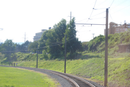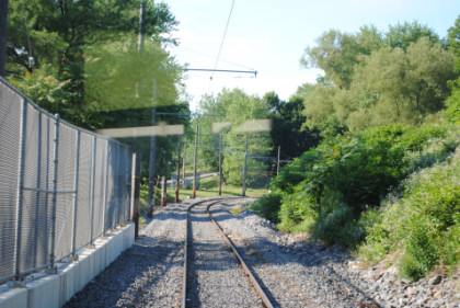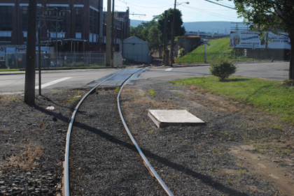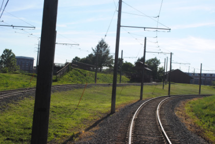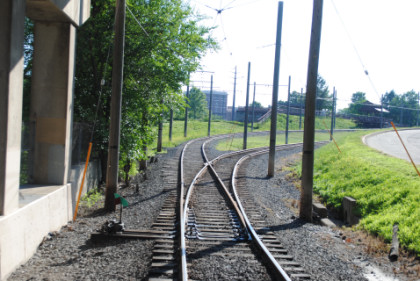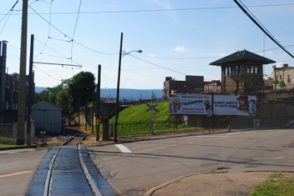 We curved off the freight line to go on the trolley-only line to PNC Park.