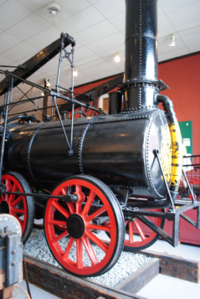 This replica of the "Stourbridge Lion" was built by the Delaware & Hudson Railroad in 1932 from plans and parts of the original, which was the first steam locomotive to operate in the United States, and one of the first to operate outside Britain. Its name comes from the lion's face painted on the front, and the City of Stourbridge in England, where it was built by Foster, Rastrick & Company in 1828.