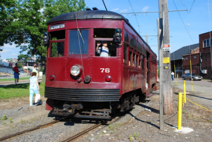 Philadelphia Suburban Transportation Company trolley 76 built by J.G. Brill in 1926 is a "Center Door" car originally built for the predecessor the Philadelphia and West Chester Traction Company. It was the highest-numbered car of a 32-car fleet of such cars bought in three orders, starting in 1919. These crowd-swallowing trolleys roamed the "Red Arrow Lines" system from 69th Street Terminal in Upper Darby to suburban terminals in West Chester, Ardmore, Media and Sharon Hill. As more modern cars arrived over the years, the remaining large, heavy Center Door cars were relegated to rush-hour "tripper" service, school trips, and winter operation to keep the lines clear of snow. Car 76 was retired in 1976.