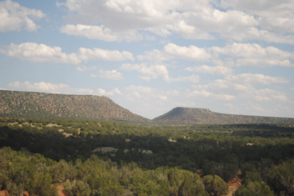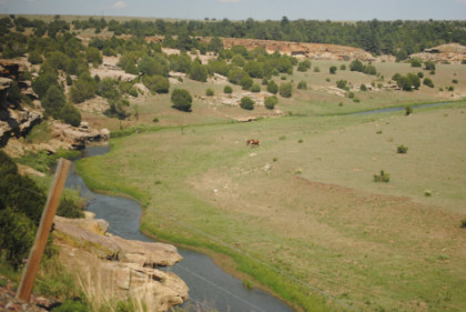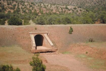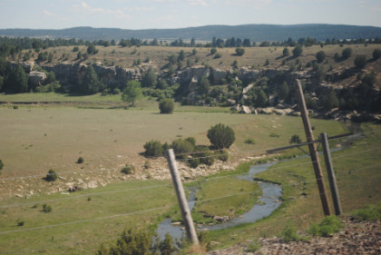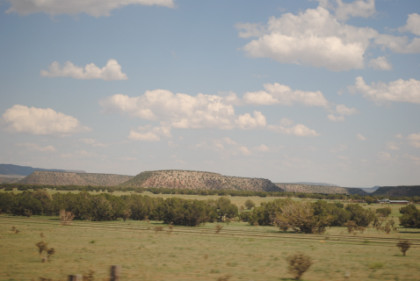 Mesas after Grants on a beautiful mid-June morning. The movie finished just after we past Dalies where there were a pair of photographers taking a picture of our train this morning. From there, it was a fast trip into Albuquerque, at which we arrived at 11:17 AM {12:12 PM} this morning and I detrained for some fresh air. After that, I was online thanks to Herzogdata and we departed on time as I listened to some CDs as the train made its way to Lamy. The train went through Apache Canyon before climbing over Glorieta Pass and while we would normally meet the westbound train here, today's version had to detour, as I did back in my drinking days, via Mulvane to get around some flooding problems last night in Kansas. We dropped down to the Pecos River before climbing up to the "S" curves and later passing Starvation Peak.