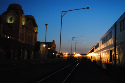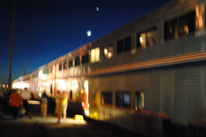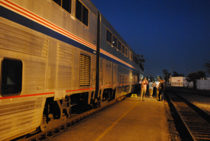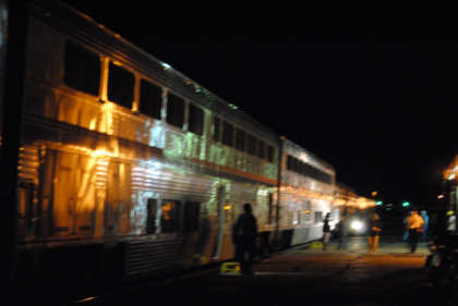 I returned to my room, turned on my computer and put on my CD of Billy Joel "The Stranger" as I relaxed until departure time of 6:55 PM. The train left Los Angeles on time and made its way to Fullerton where I took fresh air before going in for dinner at 7:30 PM. I was seated with a Boy Scout whose rank was Life going to Raton and onto Philmont Scout Camp, a man going to Denver and a delightful young woman who does Mexican Gangster Rap, a cast of characters you could only find on a train at dinner in the diner. I had the steak with vanilla ice cream for dessert then returned to my room and listened to Asia "Omega" as the train had made its Riverside stop at the end of dinner then onto San Bernardino, the next fresh air stop of the trip.