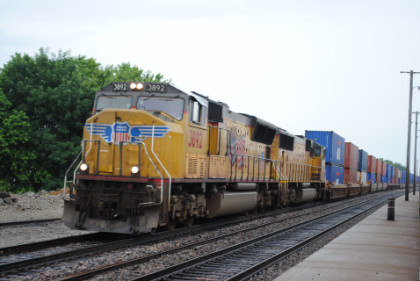 A Union Pacific stack train at Fort Madison waiting for us to clear.