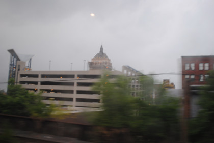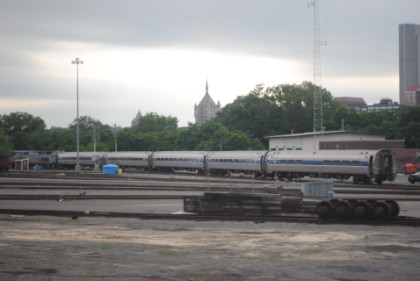 6/16/2010I woke up at 7:30 AM, finding that our train was west of Cleveland and I went to the dining car for breakfast, enjoying French Toast and bacon. The train ran along the Cleveland RTA Line then passed the Cleveland Browns stadium to the Amtrak station then continued towards Erie.