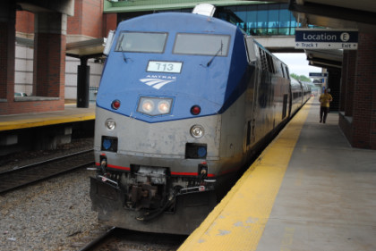 Amtrak P32AC-DM 713 built by General Electric in 1998. Before we reached the station, the Boston section would cut away from our train and go into the station; we would wait for our engine to couple onto us and pull us in.