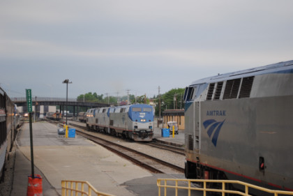 The Mississippi River from the bridge. We later took the Cameron Connection from the former Santa Fe line to the former Chicago, Burlington and Quincy to reach Galesburg as I listened to Alice Cooper's "Along Came A Spider" as the rain continued. It was announced that all Cardinal passengers would detrain at Galesburg and be bussed to Indianapolis. We departed Galesburg at 3:13 PM {12:00 PM} before heading next to Princeton and Mendota and I put on my CD of Chicago "If You Leave Me Now" as the rain stopped and the afternoon light returned. After that, it was Jethro Tull's "Songs from the Wood" as the Southwest Chief headed towards Naperville back into the rain then the final sprint to Chicago Union Station on a rainy late afternoon, arriving at 6:05 PM {3:10 PM}, ending another interesting trip onboard the Southwest Chief.