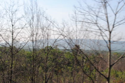 View of the ridge line through some trees as we start down the grade.