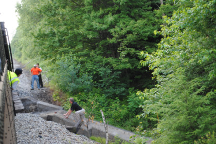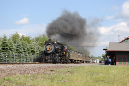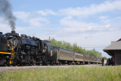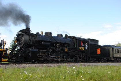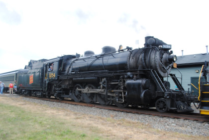 Canadian National 2-8-2 3254. We then learned that a truck had hit the Jubilee Road bridge, knocking it out of alignment so we could not continue our journey and sat. Buses were called but then we received word that we would be allowed to cross the bridge, at a slower-than-walking speed.