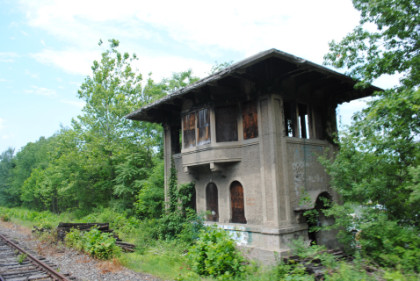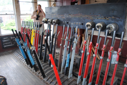 East Stroudsburg Tower built in 1908 which stands near the corner of Lackawanna and Analomink Streets in East Stroudsburg. In its glory days, as part of the Delaware, Lackawanna and Western Railroad, the tower controlled the switches and signals on the main tracks between Broad Street and Federal Street. The tower is the last remaining DL&W wood railroad tower in Pennsylvania (and perhaps on the entire railroad), and still contains the original mechanical interlocking machine. While our tower no longer controls switches or signals, a few of these large levers can still be operated to demonstrate the features of these machines. No mechanical interlocking machines of this type remain in service in the United States.