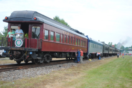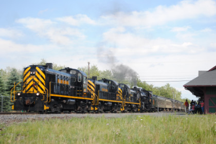 The RS-3s and steam engine pulled the train up the grade to the summit at Pocono Summit.