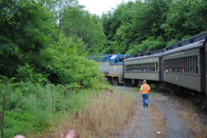 Problem! Delaware and Hudson 7304 derailed one wheel and our train came to a quick stop, which was my first derailment in over 1,248,000 rail miles. A plan was quickly devised and Nickel Plate 514 from Steamtown would pull us back into the Steamtown station where we would all detrain but return by 11:30 AM to resume the trip.