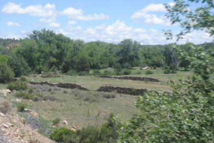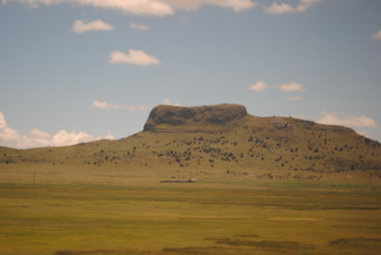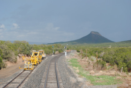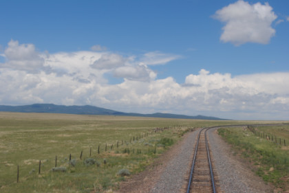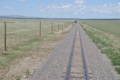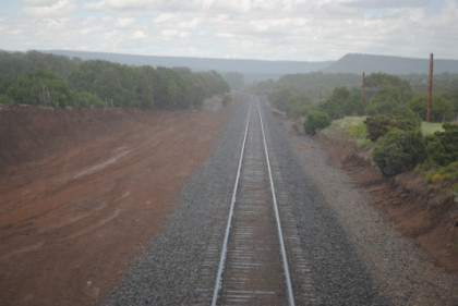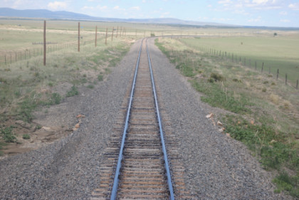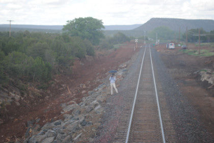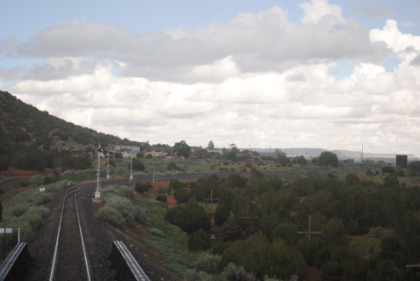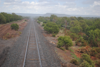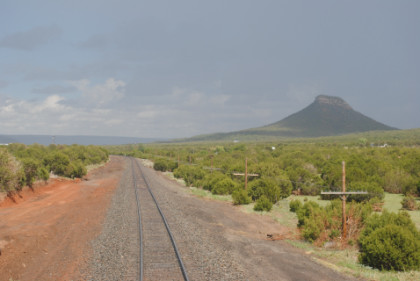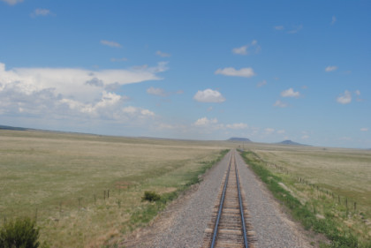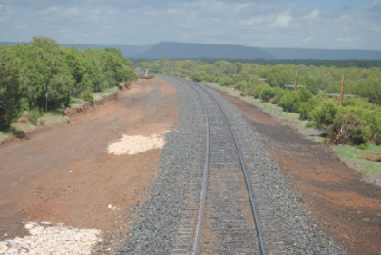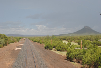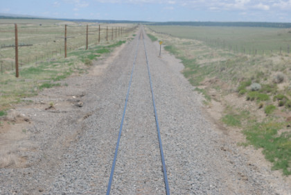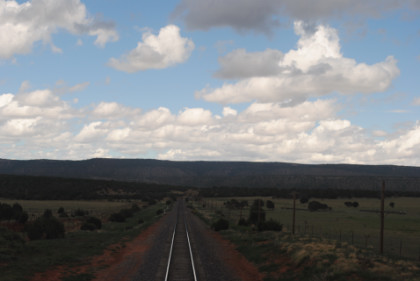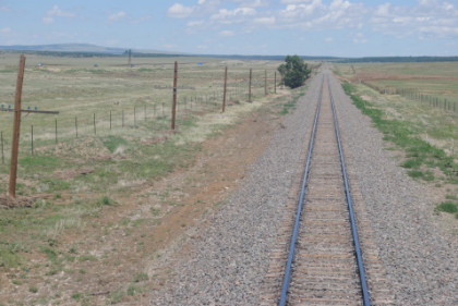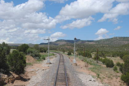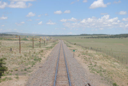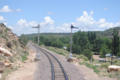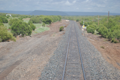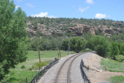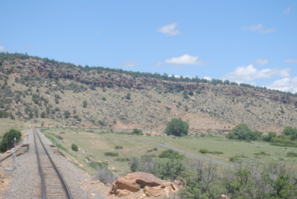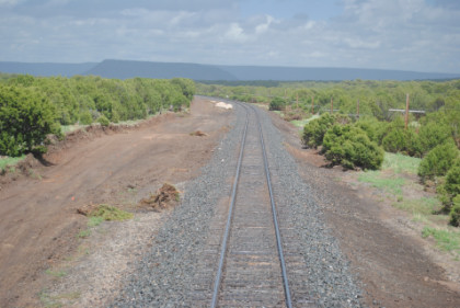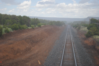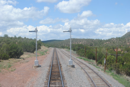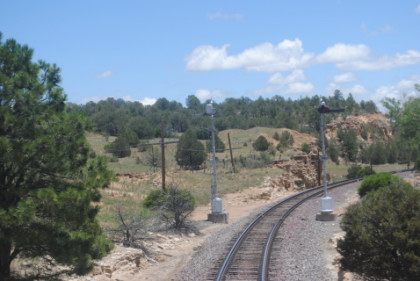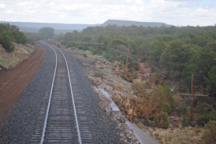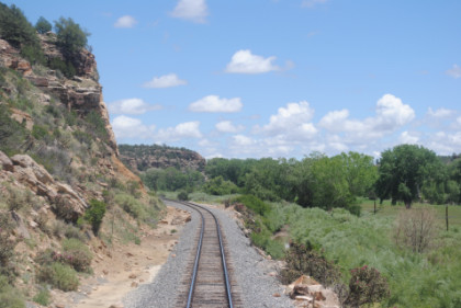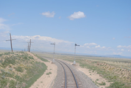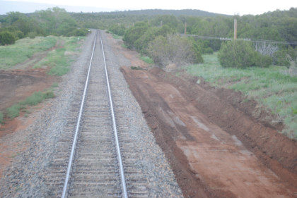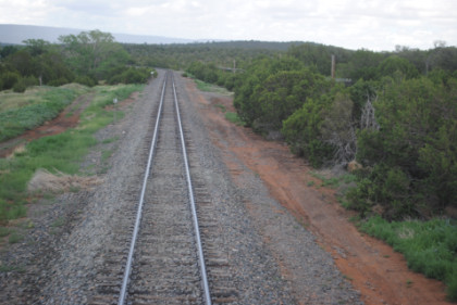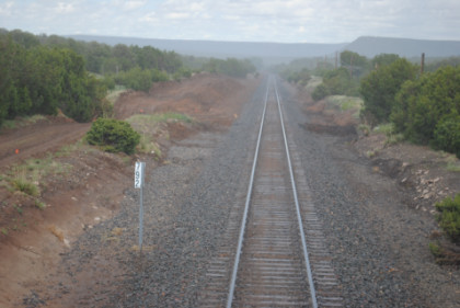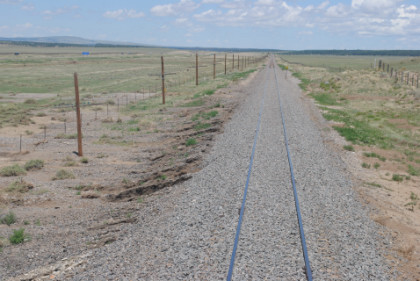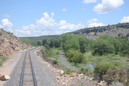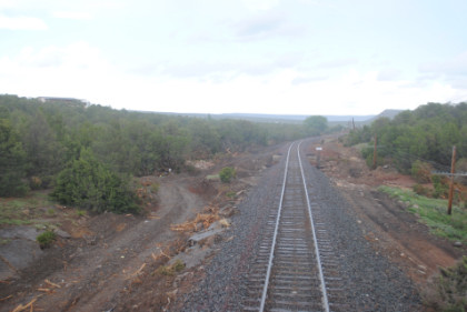 The BNSF equipment was ready to resume work. The train took the "S" curve and crossed the Pecos River then we climbed up and over Glorieta Pass and down through Apache Canyon into Lamy, where a BNSF ballast train was waiting. From here, we proceeded to Albuquerque at a slower-than-normal speed as we were waiting on a New Mexico Railrunner train to Santa Fe which we met at Domingo. After a second meet with another one of their trains, we arrived at Albuquerque and I accessed the Internet using Herozdata to upload the pictures and story so far so Winston could start proofing. We departed at 6:55 PM {4:55 PM} with me in the dining car, seated with three other passengers. There was no bottled water so I had to go back to my room to get some. In addition, there was no bacon at lunch and they were out of all desserts except ice cream but I enjoyed another excellent steak and the vanilla ice cream.