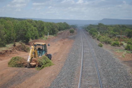 A view looking back. The train stopped to wait for men and equipment to clear the tracks.