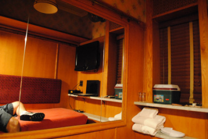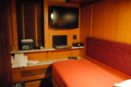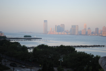 The view from the bathroom down the hall shows the Hudson River and Hoboken, New Jersey. The room had wireless Internet, a TV/DVD player and a control for temperature, along with towels and a robe. There is plenty of luggage storage under the bed or on the shelf above the bed. The bathroom down the hall has sinks, private toilets and shower. The bed is wider than the ones I sleep in on Amtrak and I slept well with an interior room. The Jane Hotel is an interesting hotel to stay in while in New York City and I would stay here again.