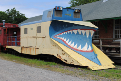 Long Island Railroad snowplough W83 built by the railroad. The maintenance-of-way crews painted the plough with shark teeth, a tribute to the famous film that took place on the south shore and it is now known as "Jaws III".