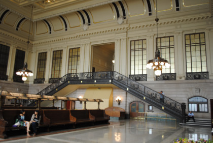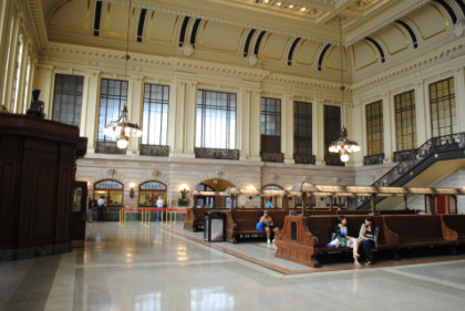 The large main waiting room features floral and Greek Revival motifs in tiled stained glass by Louis Comfort Tiffany set atop bands of pale cement. The terminal exterior extends to over four stories and has a copper-clad façade with ornate detailing. It is said the copper used for it is leftover from the Statue of Liberty. Its single-story base is constructed of rusticated Indiana limestone. A grand double stair with decorative cast-iron railings within the main waiting room provides an entrance to the upper-level ferry concourse.
