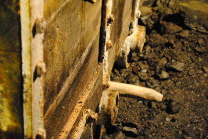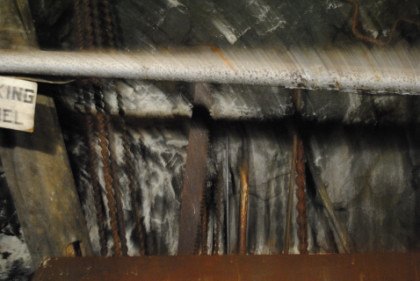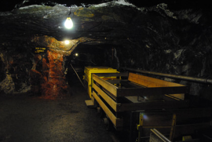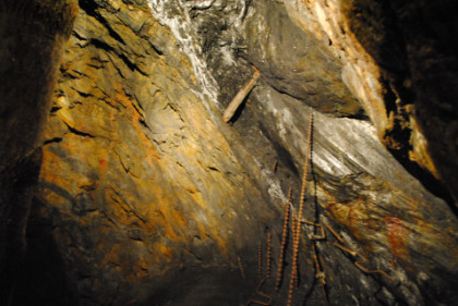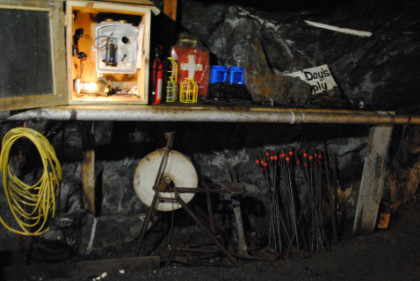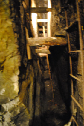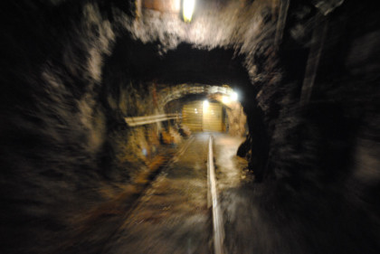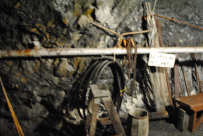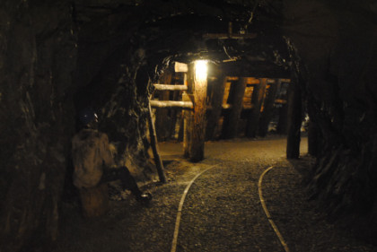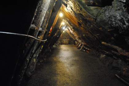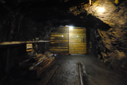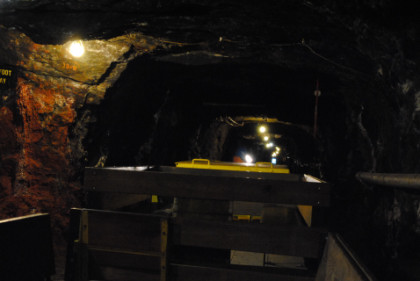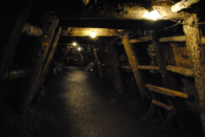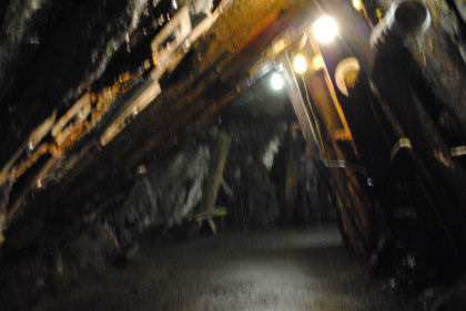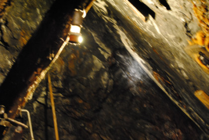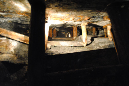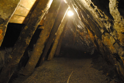 View of a tunnel. The supports do not hold up the mine but are a warning feature. If they start to crack, then a cave-in will occur, so if you hearing a cracking sound, you get out before the cave-in happens.