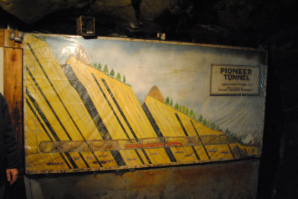 The Pioneer Tunnel was owned and operated the Philadelphia and Reading and Iron Company from 1911 to 1931. This mine echoed the grunts of gritty-faced miners, the crunch of pick against coal and the screech of overloaded iron wheels. Water dripped from the dank, heavy timbering overhead to mix with the sweat of straining mules. Oil torches, and later carbide lamps, flickered in the darkness, pointing bright fingers to the glistening rocks. And when the day was over, scores of tired, dirty eyes came out and squinted in the fading light.