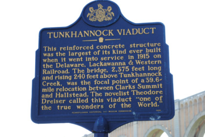 Tunkhannock Viaduct, a concrete deck arch bridge on the Nicholson Cutoff rail segment of the Norfolk Southern Railway Sunbury Line that spans Tunkhannock Creek in Nicholson. Measuring 2,375 feet long and towering 240 feet when measured from the creek bed (300 feet from bedrock), it was the largest concrete structure in the world when completed in 1915 and still merited "the title of largest concrete bridge in America". Built by the Delaware, Lackawanna and Western Railroad, the bridge is owned today by Norfolk Southern Railway and is used daily for regular through freight service.