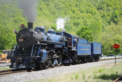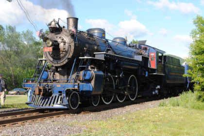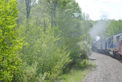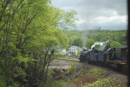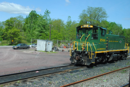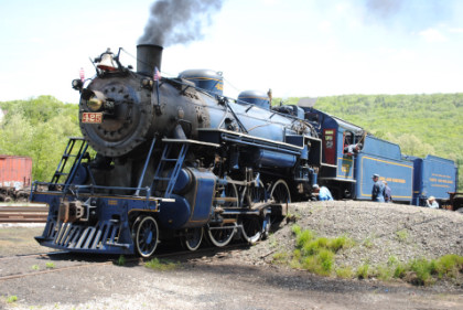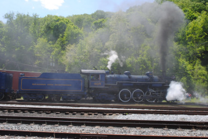 Reading and Blue Mountain 425 reversing towards the town. I walked back and stopped at the gift shop for a T-shirt then went to the Gulf service station for a Coca-Cola before I sat under a tree on a beautiful afternoon. The train arrived at the station at 3:20 and we left Jim Thorpe at 4:00 PM as I relaxed most of the way back to Tunkhannock. About six miles out, we stopped as the handle on the tender had jiggled shut, stopping the water to the engine. A brief stop was made to fix it and during the delay, the crew played trivia over the public address system before we arrived back in Tunkhannock at 7:42 PM. Randy and I took the first shuttle bus back to the car. It had been a wonderful trip behind the Reading and Blue Mountain steam engine today.