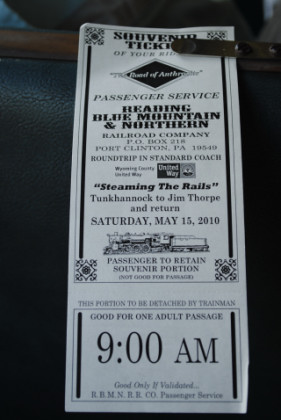 The TripThe train consisted of Reading Blue Mountain & Northern 4-6-2 425, Lehigh Gorge SD50 426, coaches 303, 309, 306, 304, 302, 305, 308 and 307 with private cars 5 "Schuylkill River" and 1 "Black Diamond". Here is my ticket for the trip today.