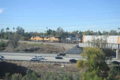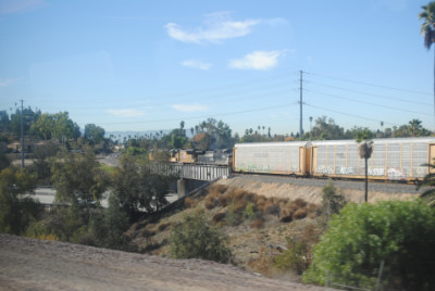 Steve and I walked back across the pedestrian bridge to the east platform to wait for Metrolink 811 to arrive. As it approached, a Union Pacific auto train was coming but too slowly to get a picture. We boarded the cab car and I then had an idea for a picture of the freight train.