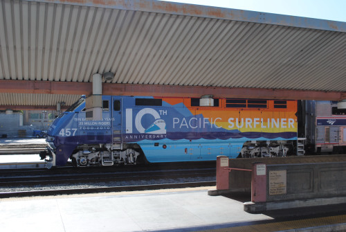 The newly-wrapped Pacific Surfliner 457 10 Years of Pacific Surfliner Service as we departed.