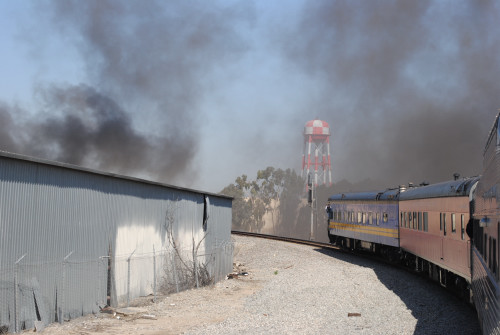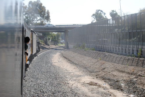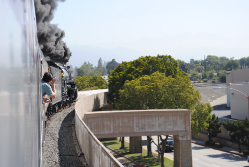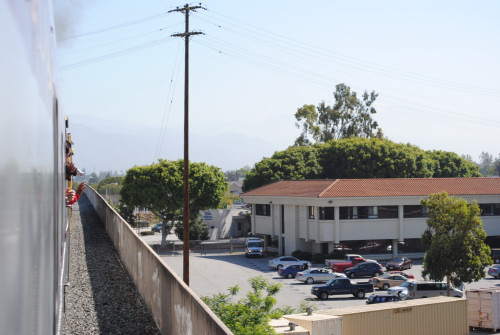 The train high over El Monte as our locomotive managed to stop baseball games on the baseball fields below our route.