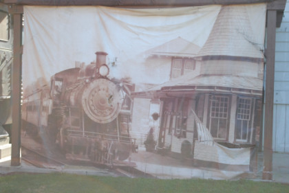 Steam engine and station photograph on a tarpaulin between the museum and theatre at La Habra.