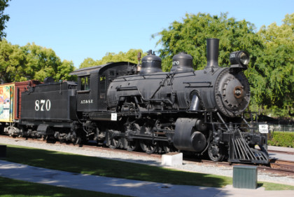 Santa Fe 2-6-0 870, ex. Albuquerque and Los Cerrillos Coal 870 1940, exx. Rocky Mountain and Santa Fe 870 1915, nee St. Louis, Rocky Mountain and Pacific 101 built by Baldwin in 1906. Despite its sweeping name, the StLRM&P operated entirely in northern New Mexico, mainly serving the coal fields around Raton Pass. It was taken over by the AT&SF in 1913 and operated as a subsidiary. The Santa Fe changed the name to the Rocky Mountain & Santa Fe in 1915 and renumbered the locomotives 870-874. In 1940, the Santa Fe sold three 2-8-0s to the Albuquerque & Los Cerrillos Coal Company, which operated a coal mine in Madrid, New Mexico, connected by a branch line from the AT&SF at Waldo. As demand for coal fell off in the 1950's, however, the mine was shut and the branch line abandoned in 1959. 769 and 870 were left at Madrid sitting amid the remains of the mine operation. In 1989, the City of Santa Fe Springs acquired 870. The locomotive was restored to its post-1924 Santa Fe appearance and moved to the current location in Heritage Park.