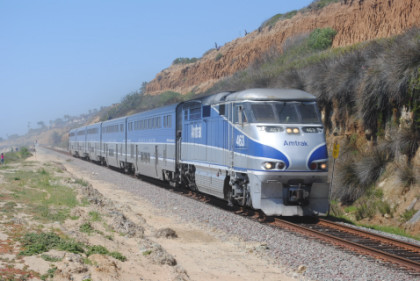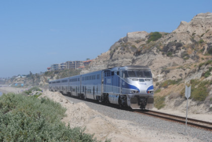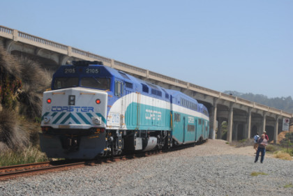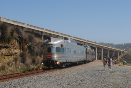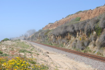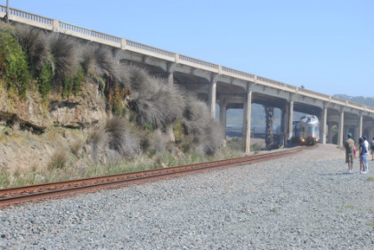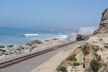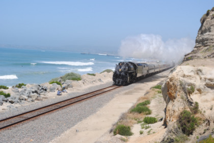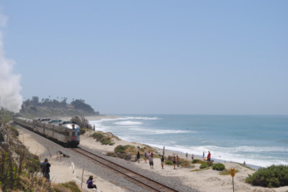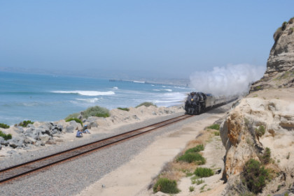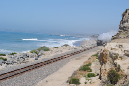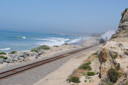 The train heads south along the Pacific Ocean. After Bob and I put our feet in the Pacific Ocean, we had a green signal and waited for our next train.