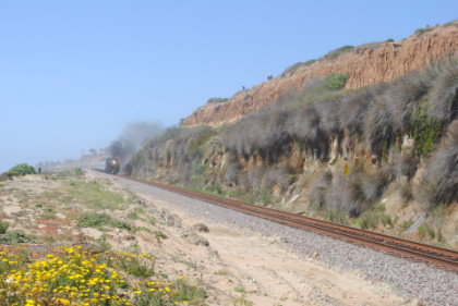 The train bound for Fullerton to pick up more passengers. We returned to the car and drove to Interstate 5 and once in Orange County, took the carpool lane all the way to San Clemente, where we exited at Avendia Califia and parked down at the beach. After feeding the parking meter, we walked down along the tracks to our next photo location.