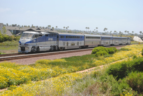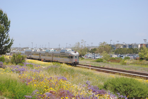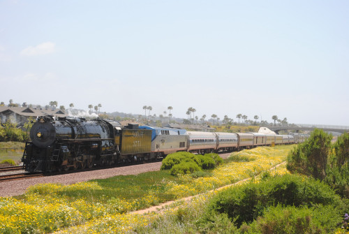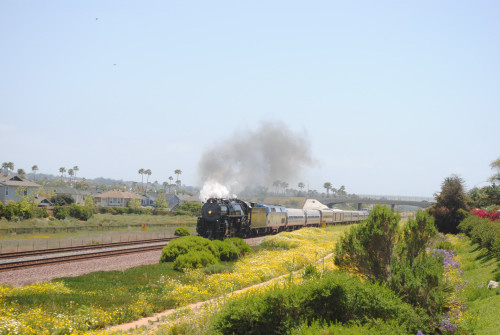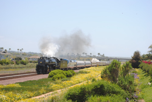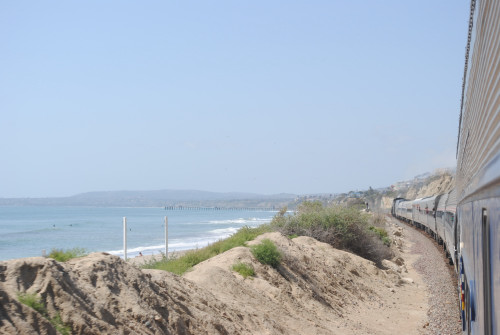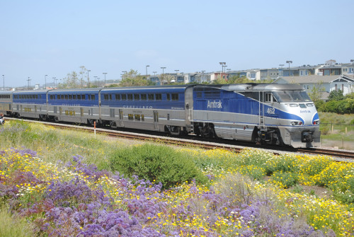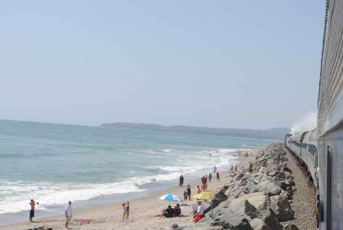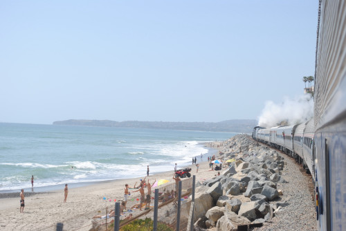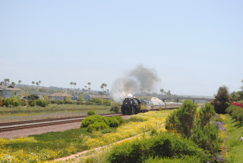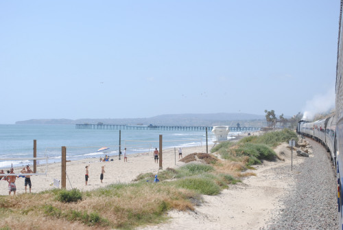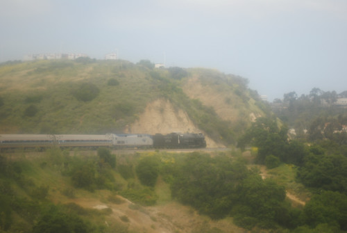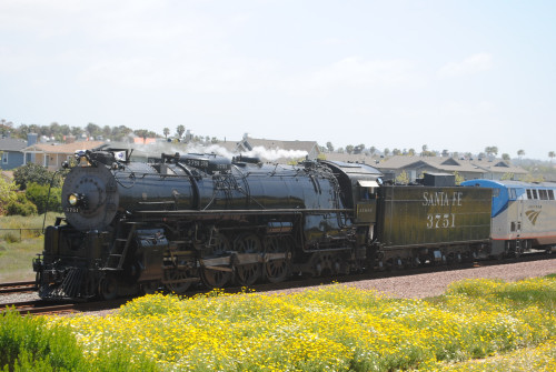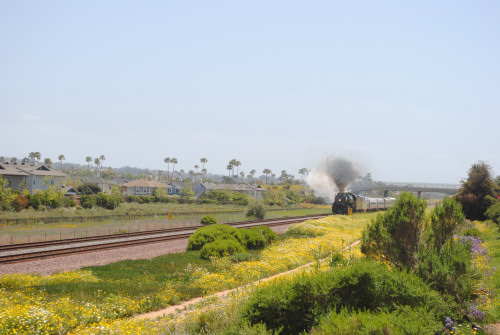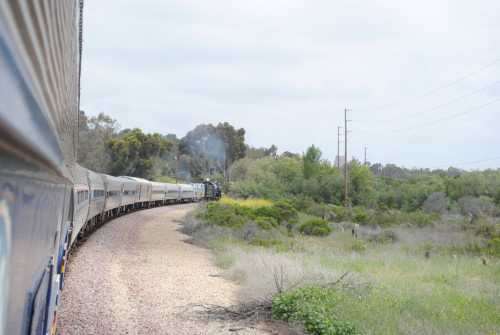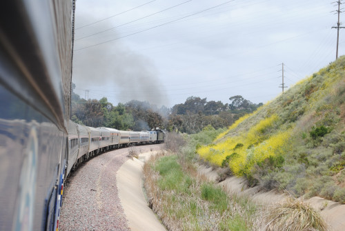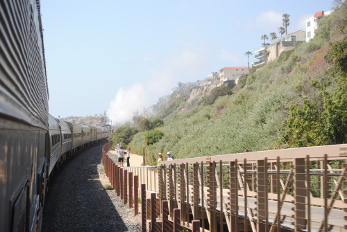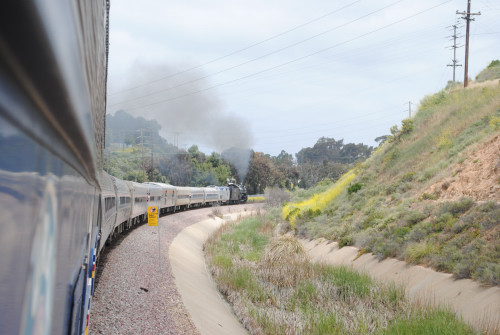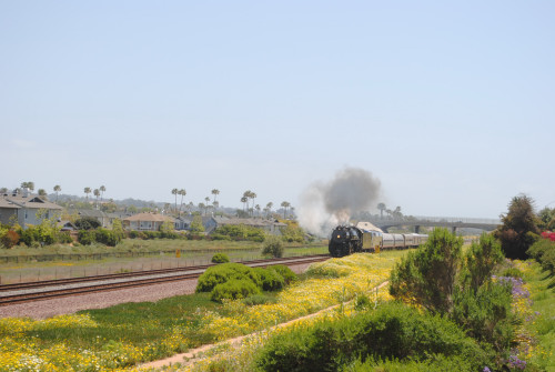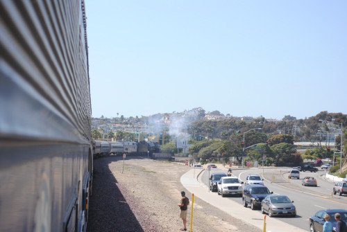 Pacific Surfliner 775 at Poinsetta. The steam train reversed two miles after getting a clear signal. Once he received a clear signal at Ponto, 3751 came charging towards us at 60 MPH.