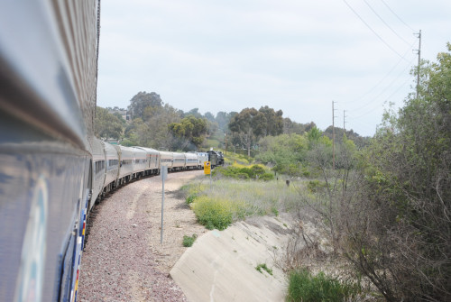 Photo runby one at Poinsetta. The train then reversed and we all reboarded, departing at 1:24 PM then headed next through Carlsbad and on to Oceanside, where we made a short passenger stop after a Sprinter went by. It departed Oceanside at 1:40 PM and crossed the San Luis Rey River, passed through Eastbrook and Westbrook before crossing the Santa Margarita River and arrived at Stuart Mesa for a watering and servicing stop.