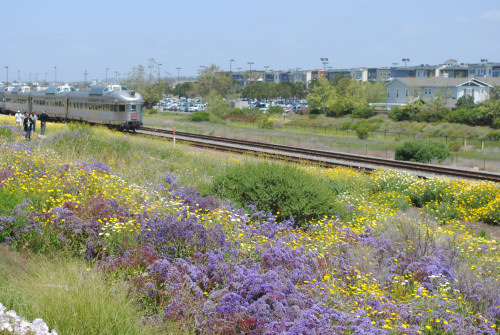 Santa Fe 3751 dropping down the Miramar Grade before reaching Sorrento Valley, where we went into the siding for a Coaster Baseball Train, which passed us at 11:45 AM. The steam train crossed the wetlands before passing under the Coast Highway bridge and running along the Del Mar Bluffs then through Del Mar and minutes later, the trench at Solana Beach. Next we headed into the siding at Cardiff where we met Pacific Surfliner 768. Once on the move again, we went through Encinitas and Leucadia before we made our photo stop at the Poinsetta Coaster station.